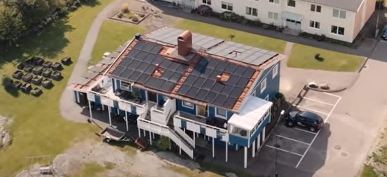 Heating center of the Swedish Heinöhem district with 94 Dualsun PVT panels on the roof installed in 2021 taken from the YouTube video of the contractor Enwell